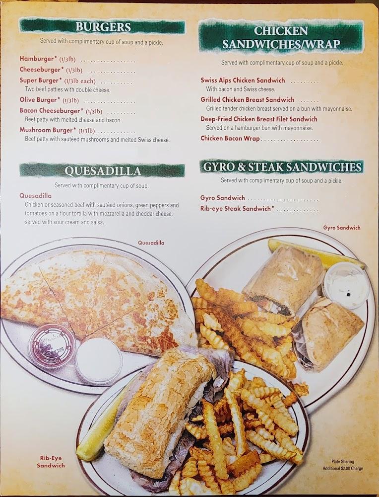 The menu at Swiss Alps Restaurant offers a delightful array of American staples. Breakfast lovers will appreciate the variety, including omelets, pancakes, and breakfast skillets. Don't miss the Denver Omelette or the famous Biscuits & Gravy; they hit the spot. For lunch, options like burgers, sandwiches, and gyros star on the menu, each made to order. The children's menu makes it easy for families to dine together. With an impressive 73 total dishes, there's something for everyone. Vegetarian options are available too, ensuring diners with all preferences are satisfied.