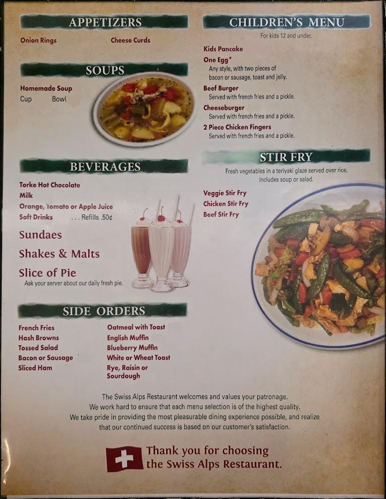 Welcome to Swiss Alps Restaurant, a cozy family-friendly dining spot located in Monroe, WI. Enjoy a delightful selection of classic American breakfast and lunch options in a charming atmosphere adorned with Swiss-inspired decorations and murals. Our menu features a range of hearty dishes perfect for any appetite, complemented by excellent coffee and local specialties. Whether you're dining solo or with family, you'll find a welcoming space with accessible seating and facilities. We pride ourselves on providing convenient services, including takeout, delivery, and a private dining area, all designed to make your experience enjoyable and memorable.